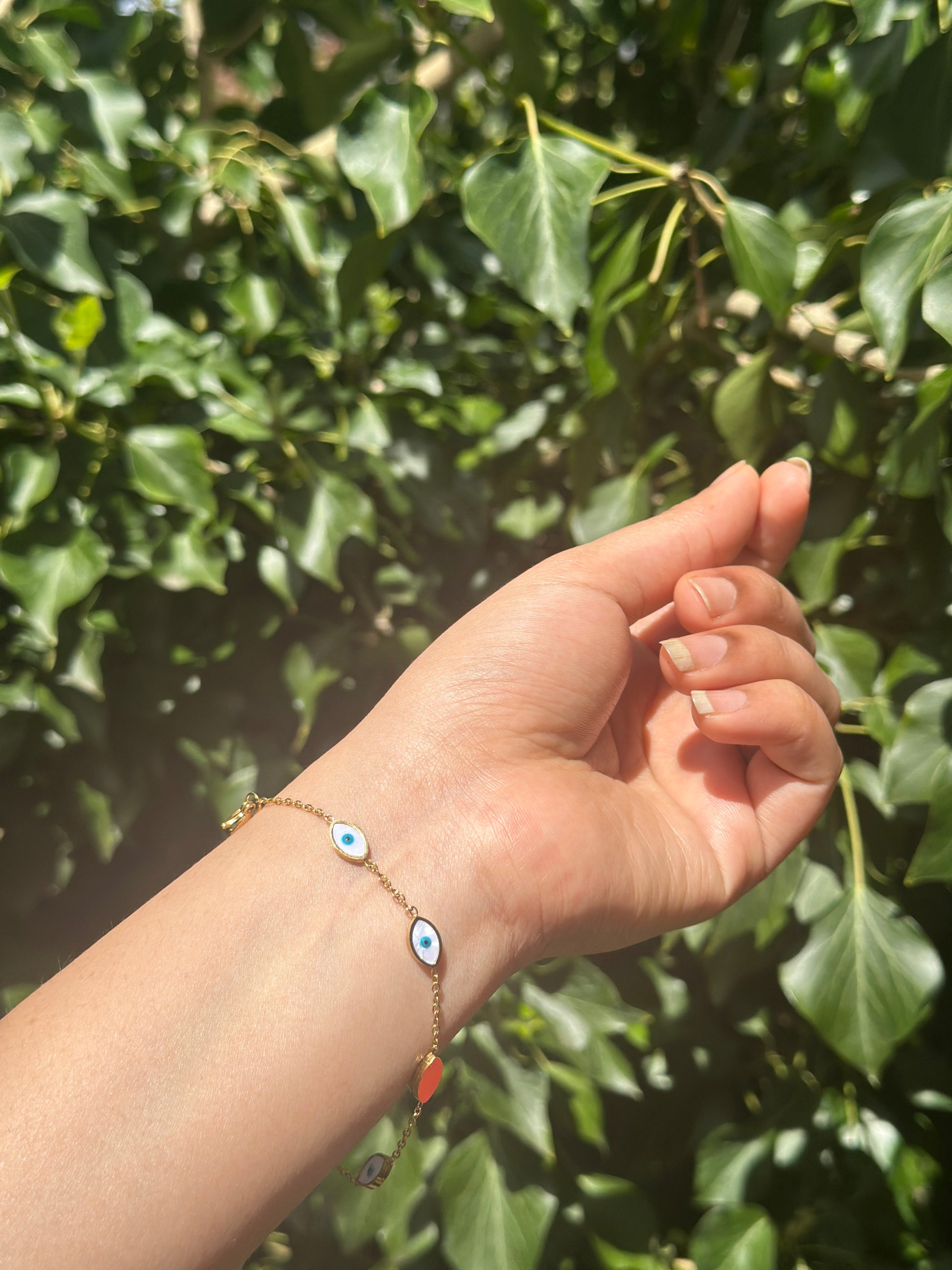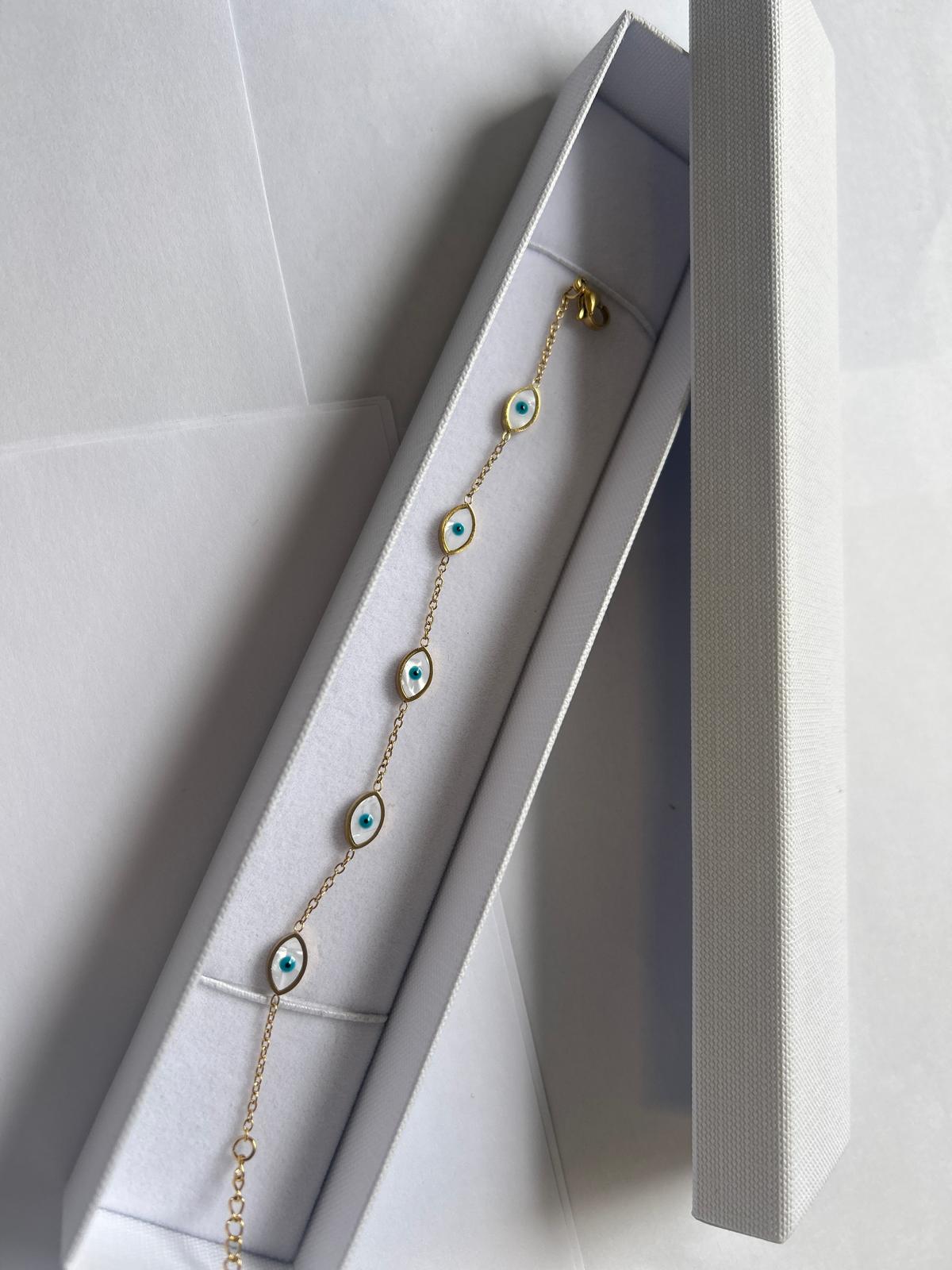 Description: Designed for easy, everyday style, this delicate bracelet features the iconic Evil Eye for a touch of calm and good luck. Its soft gold tone suits any outfit, and the light chain feels comfortable all day. Perfect for layering or wearing alone, it’s a meaningful piece that you’ll never want to take off.